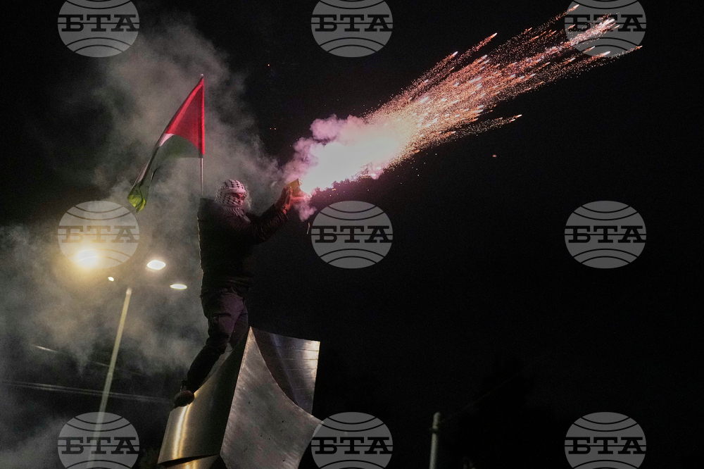 A protester holding a Palestinian flag throws fireworks toward the Israeli Embassy in Athens during a pro-Palestinian demonstration, Tuesday, Oct. 7, 2025, marking the two-year anniversary of Hamas' attack on Israel. (AP Photo/Petros Giannakouris)