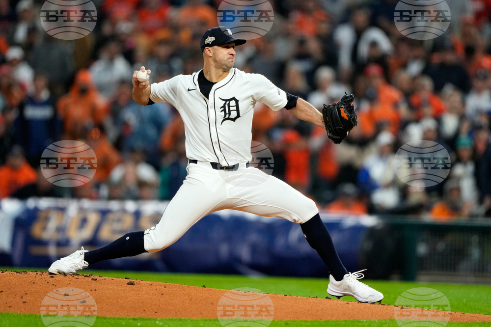 Detroit Tigers starting pitcher Jack Flaherty throws during the first inning in Game 3 of baseball's American League Division Series against the Seattle Mariners Tuesday, Oct. 7, 2025, in Detroit. (AP Photo/Ryan Sun)