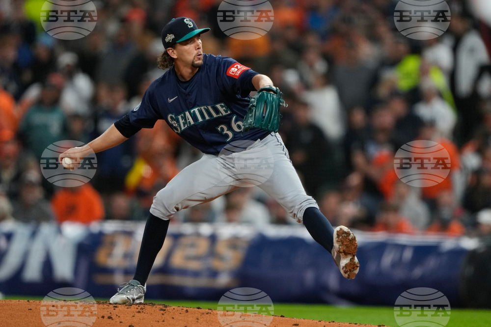 Seattle Mariners starting pitcher Logan Gilbert throws during the first inning in Game 3 of baseball's American League Division Series against the Detroit Tigers Tuesday, Oct. 7, 2025, in Detroit. (AP Photo/Ryan Sun)