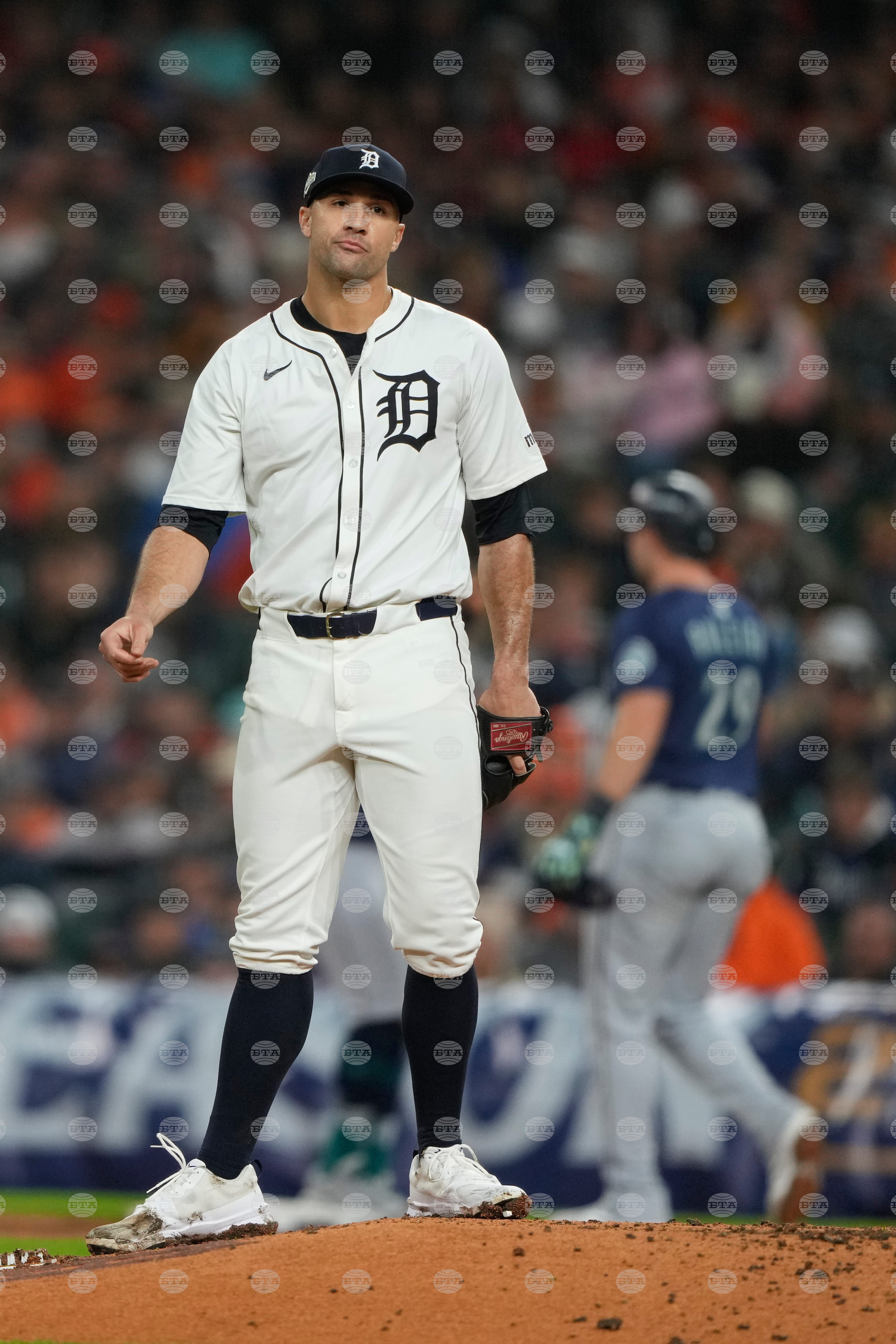 Detroit Tigers starting pitcher Jack Flaherty reacts after walking Seattle Mariners' Cal Raleigh, right, during the third inning in Game 3 of baseball's American League Division Series Tuesday, Oct. 7, 2025, in Detroit. (AP Photo/Ryan Sun)