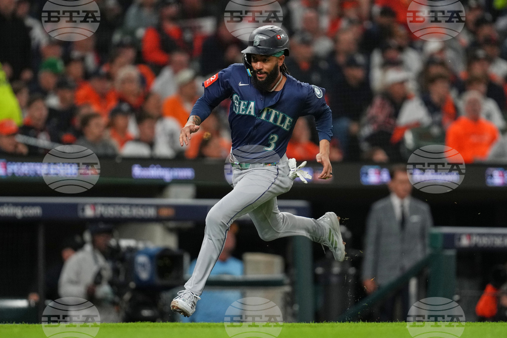 Seattle Mariners' J.P. Crawford rounds third on his way to score on a single by Randy Arozarena during the third inning in Game 3 of baseball's American League Division Series Tuesday, Oct. 7, 2025, in Detroit. (AP Photo/Paul Sancya)