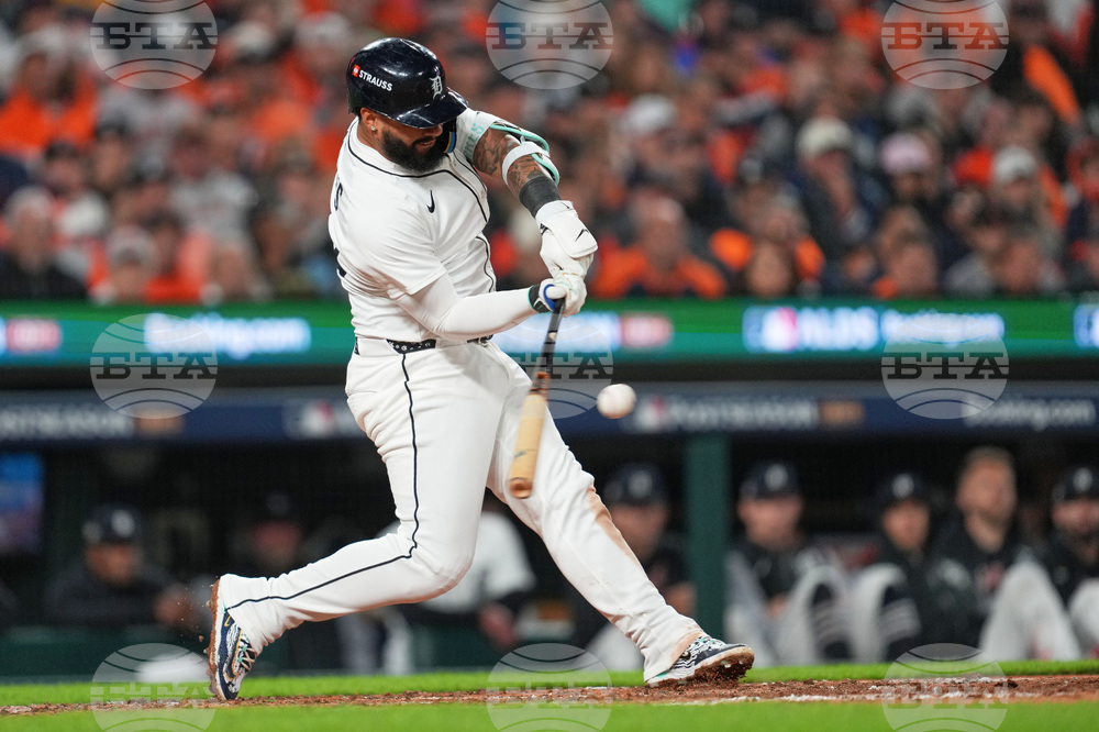 Detroit Tigers' Gleyber Torres doubles during the third inning in Game 3 of baseball's American League Division Series against the Seattle Mariners Tuesday, Oct. 7, 2025, in Detroit. (AP Photo/Paul Sancya)