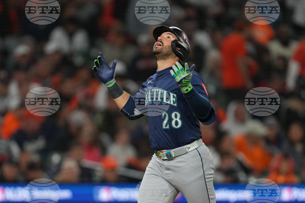 Seattle Mariners' Eugenio Suárez hits a solo home run during the fourth inning in Game 3 of baseball's American League Division Series against the Detroit Tigers Tuesday, Oct. 7, 2025, in Detroit. (AP Photo/Paul Sancya)
