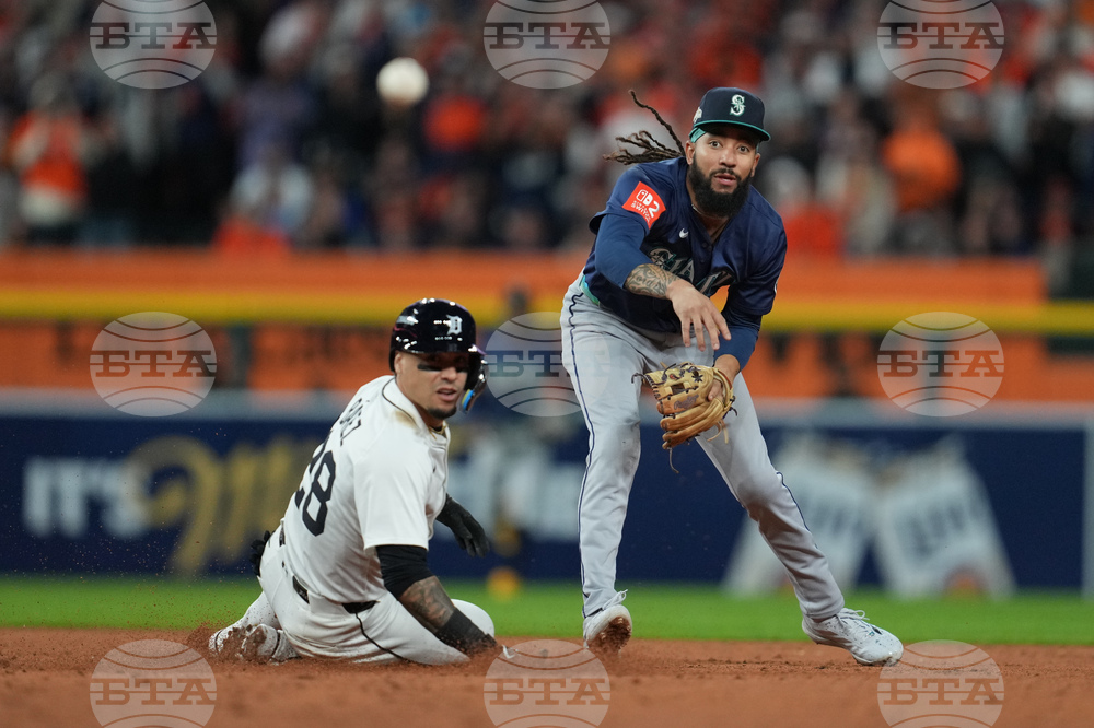 Detroit Tigers' Javier Báez, left, is out at second as Seattle Mariners shortstop J.P. Crawford, right, fails to turn the double play allowing the Tigers' Dillon Dingler to score during the fifth inning in Game 3 of baseball's American League Division Series Tuesday, Oct. 7, 2025, in Detroit. (AP Photo/Paul Sancya)