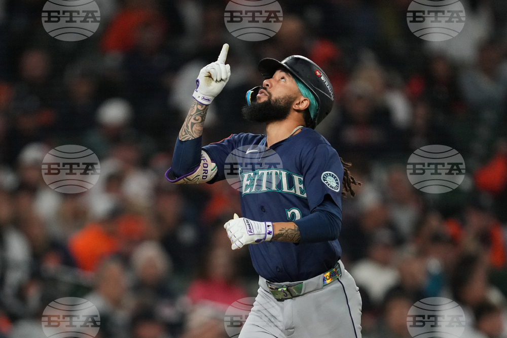 Seattle Mariners center fielder Julio Rodríguez celebrates a victory over the Detroit Tigers in Game 3 of baseball's American League Division Series Tuesday, Oct. 7, 2025, in Detroit. (AP Photo/Ryan Sun)