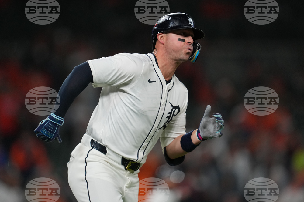 Detroit Tigers left fielder Riley Greene catches a fly ball by Seattle Mariners' Julio Rodríguez to end the top of the fourth inning in Game 3 of baseball's American League Division Series Tuesday, Oct. 7, 2025, in Detroit. (AP Photo/Ryan Sun)