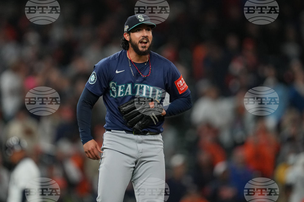 Seattle Mariners pitcher Eduard Bazardo throws during the eighth inning in Game 3 of baseball's American League Division Series against the Detroit Tigers Tuesday, Oct. 7, 2025, in Detroit. (AP Photo/Paul Sancya)