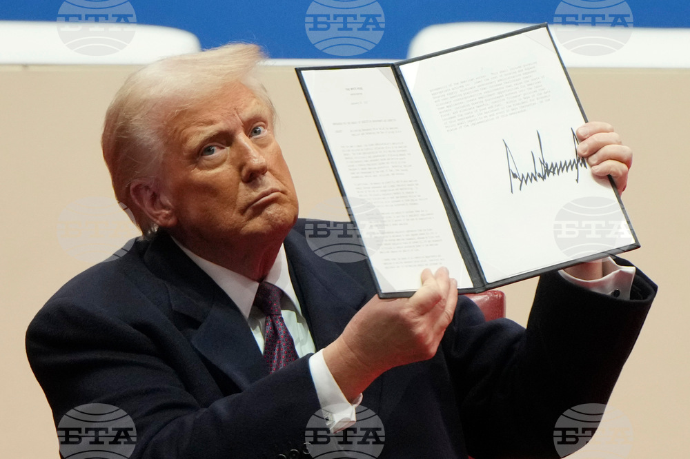 FILE - President Donald Trump holds up an executive order after signing it at an indoor Presidential Inauguration parade event in Washington, Jan. 20, 2025. (AP Photo/Matt Rourke, File)