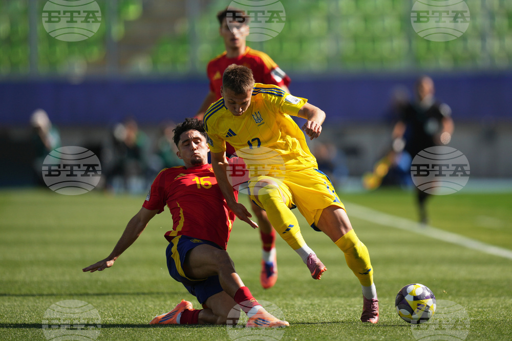 Ukraine's Yaroslav Karaman (15) and Spain's Julio Diaz battle for the ball during a FIFA U-20 World Cup round of sixteen soccer match at Elias Figueroa Brander Stadium in Valparaiso, Chile, Tuesday, Oct. 7, 2025. (AP Photo/Andre Penner)