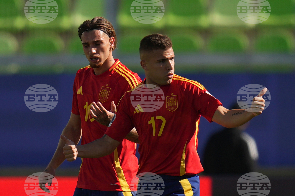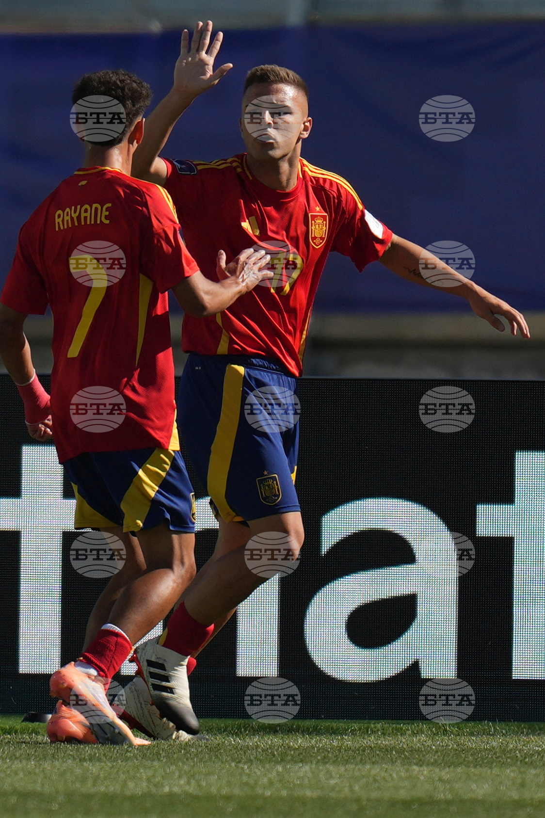 Spain's Pablo Garcia (17) celebrates scoring his side's first goal against Ukraine with teammate Rayane Belaid during a FIFA U-20 World Cup round of sixteen soccer match at Elias Figueroa Brander Stadium in Valparaiso, Chile, Tuesday, Oct. 7, 2025. (AP Photo/Andre Penner)