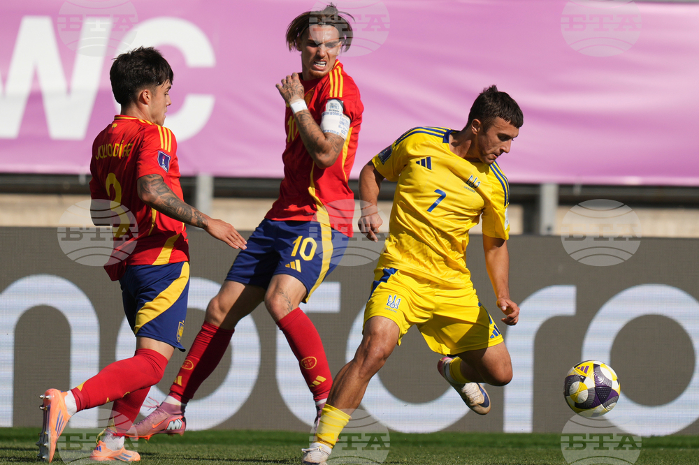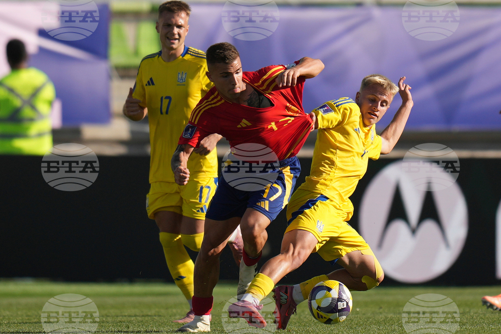 Ukraine's Maksym Derkach, right, and Spain's Rayane Belaid battle for the ball during a FIFA U-20 World Cup round of sixteen soccer match at Elias Figueroa Brander Stadium in Valparaiso, Chile, Tuesday, Oct. 7, 2025. (AP Photo/Andre Penner)