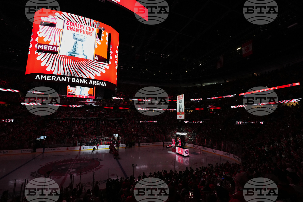 The 2025 Stanley Cup banner is raised over the arena ahead of the Florida Panthers' home opener NHL hockey game against the Chicago Blackhawks, Tuesday, Oct. 7, 2025, in Sunrise, Fla. (AP Photo/Rebecca Blackwell)