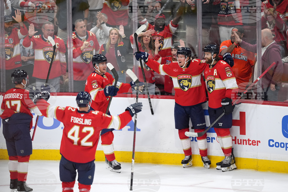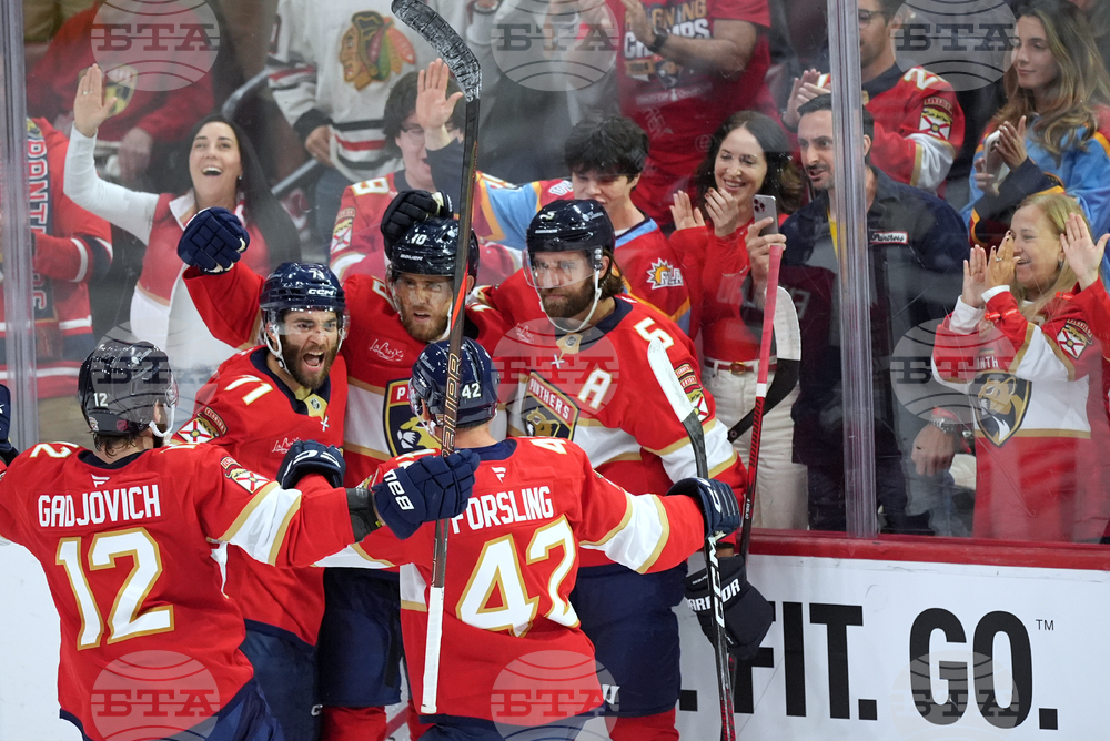 Florida Panthers left wing A.J. Greer (10) celebrates scoring the team's first goal against the Chicago Blackhawks along with teammates including defenseman Aaron Ekblad (5), during the first period of an NHL hockey game, Tuesday, Oct. 7, 2025, in Sunrise, Fla. (AP Photo/Rebecca Blackwell)