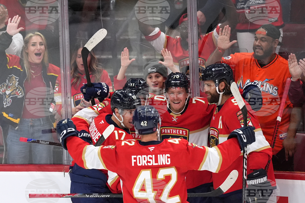Florida Panthers players celebrate after defeating the Chicago Blackhawks in an NHL hockey game, Tuesday, Oct. 7, 2025, in Sunrise, Fla. (AP Photo/Rebecca Blackwell)