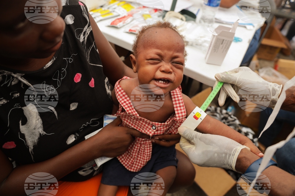 A malnourished child is checked on by a doctor from an traveling pharmacy at a shelter for families displaced by gang violence in Port-au-Prince, Haiti, Tuesday, Oct. 7, 2025. (AP Photo/Patrice Noel)