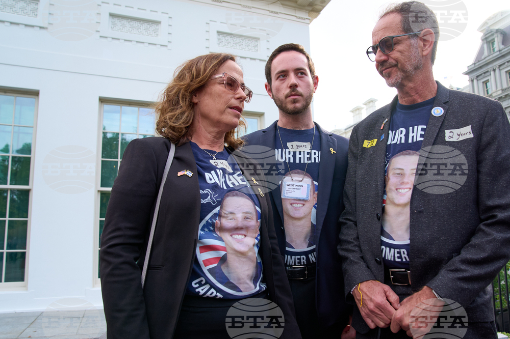Orna Neutra, left, and Ronen Neutra, right with their son Daniel Neutra, center, speak to reporters about their son Omer Neutra, a U.S.-Israeli citizen who was killed by Hamas and his body taken to Gaza, after meeting with President Donald Trump, Tuesday, Oct. 7, 2025, at the White House in Washington. (AP Photo/Jacquelyn Martin)