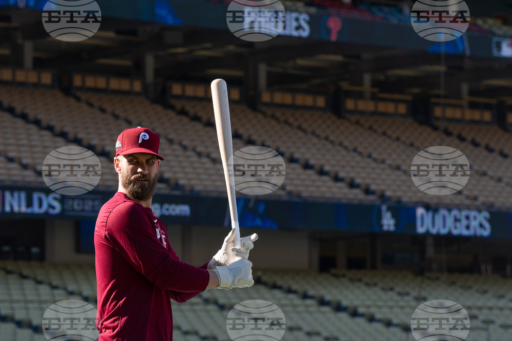 Philadelphia Phillies' Bryce Harper gets ready for batting practice Tuesday, Oct. 7, 2025, in Los Angeles, the day before Game 3 of baseball's National League Division Series against the Los Angeles Dodgers. (AP Photo/Jae C. Hong)
