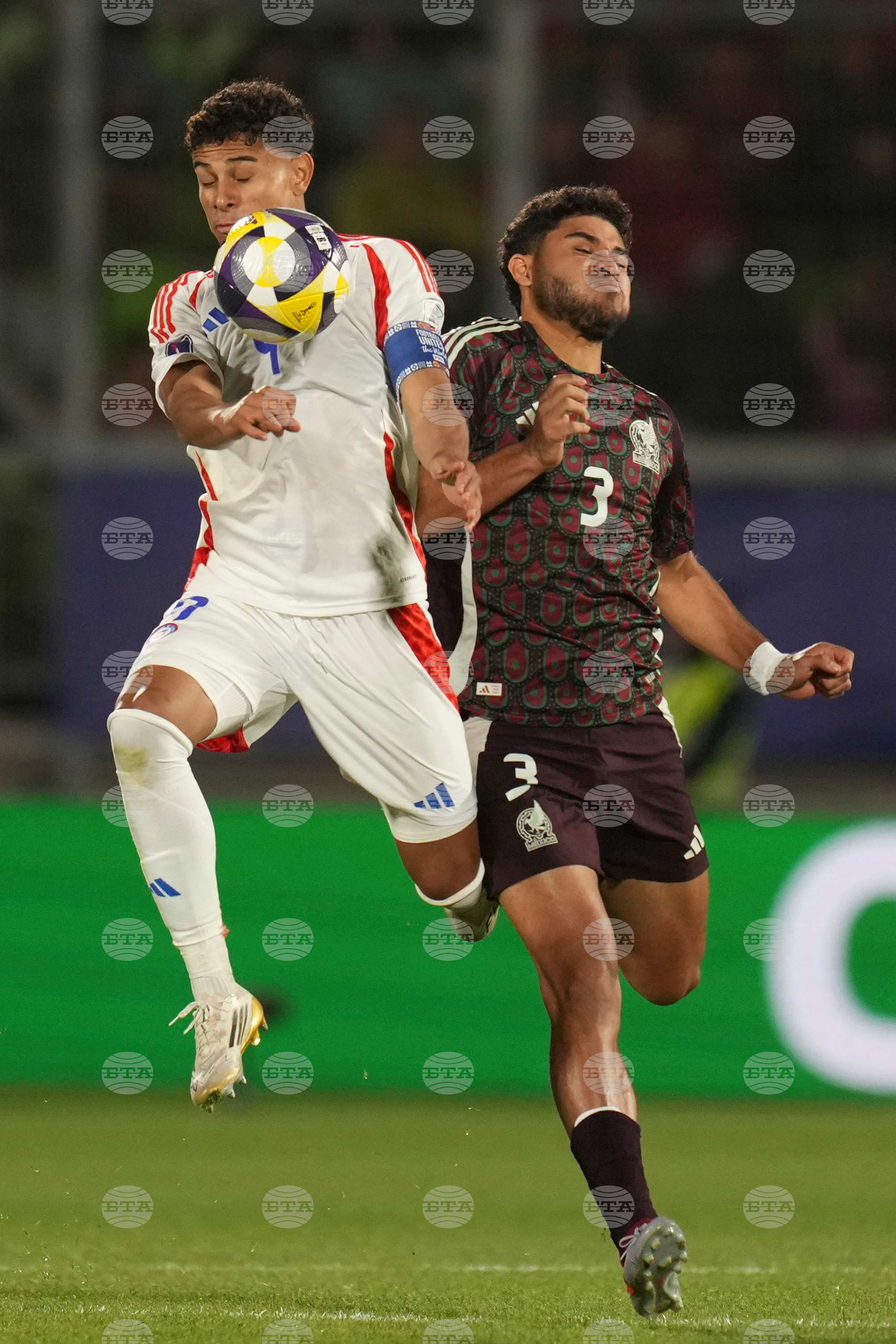 Chile's Ian Garguez, left, and Mexico's Diego Sanchez battle for the ball during a FIFA U-20 World Cup round of sixteen soccer match at Elias Figueroa Brander Stadium in Valparaiso, Chile, Tuesday, Oct. 7, 2025. (AP Photo/Andre Penner)