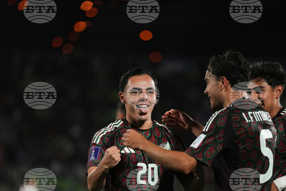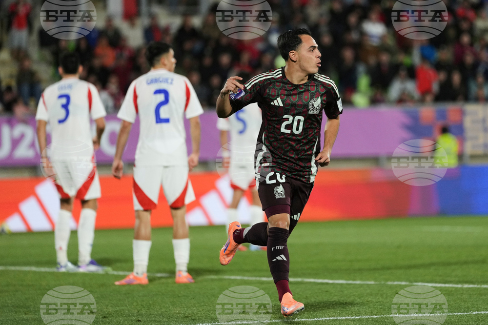 Mexico's Hugo Camberos (20) celebrates scoring his side's third goal against Chile during a FIFA U-20 World Cup round of sixteen soccer match at Elias Figueroa Brander Stadium in Valparaiso, Chile, Tuesday, Oct. 7, 2025. (AP Photo/Andre Penner)