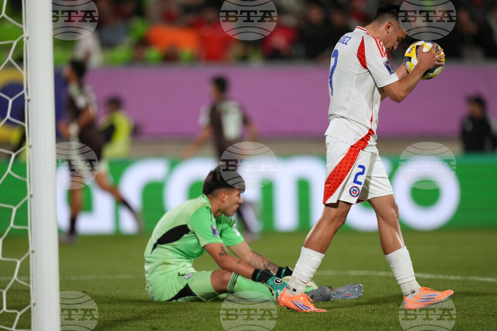 Chile's Ian Garguez (2) and goalkeeper Sebastian Mella react after Mexico's Hugo Camberos scored his side's 4th goal during a FIFA U-20 World Cup round of sixteen soccer match at Elias Figueroa Brander Stadium in Valparaiso, Chile, Tuesday, Oct. 7, 2025. (AP Photo/Andre Penner)