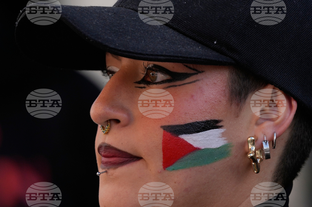 A protester demonstrates in support of the Palestinians and against Israel's war in Gaza, outside the U.S. Embassy in Bogota, Colombia, Tuesday, Oct. 7, 2025. (AP Photo/Fernando Vergara)