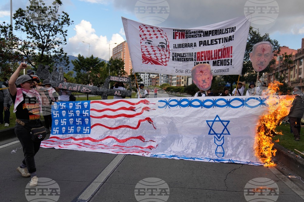 Protesters demonstrate in support of the Palestinians and against Israel's war in Gaza, outside the U.S. Embassy in Bogota, Colombia, Tuesday, Oct. 7, 2025. (AP Photo/Fernando Vergara)