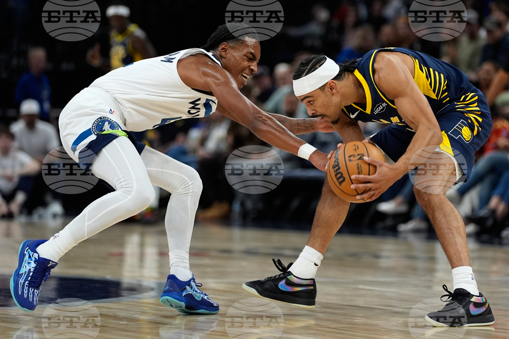 Indiana Pacers guard Taelon Peter (4) and Minnesota Timberwolves guard Johnny Juzang (9) battle for possession of the ball during the second half of an NBA basketball preseason game, Tuesday, Oct. 7, 2025, in Minneapolis. (AP Photo/Abbie Parr)