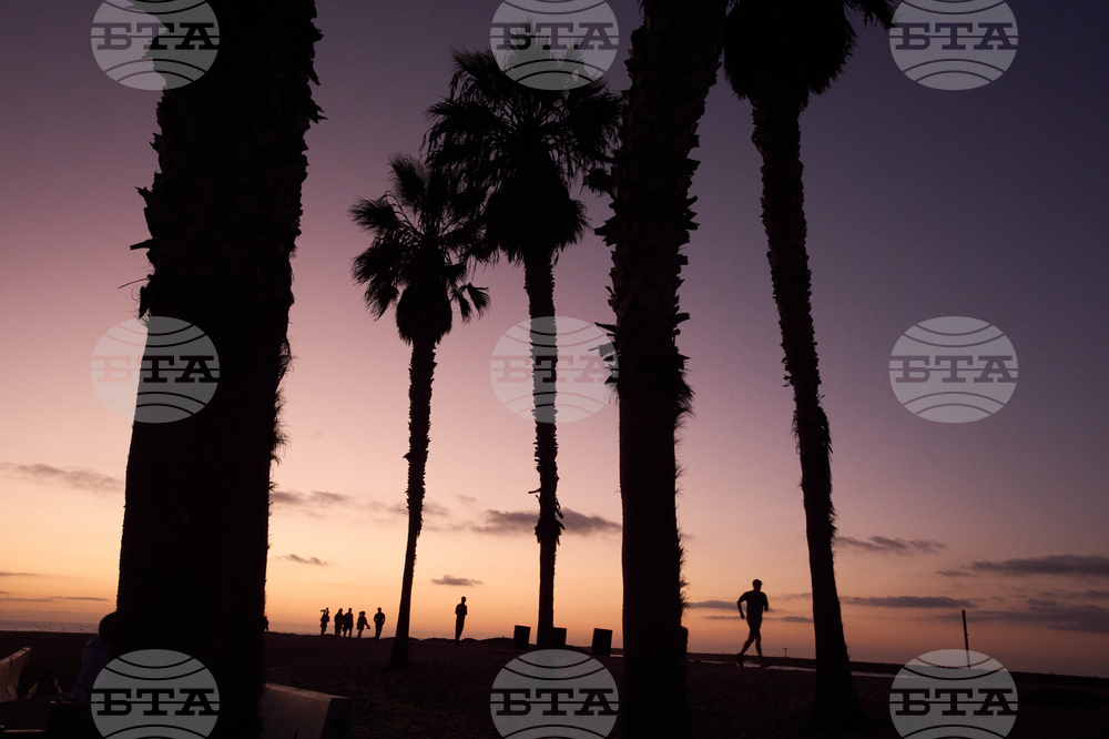 People make their way among palm trees on an Ocean Beach path as the sun sets, Tuesday, Oct. 7, 2025, in San Diego. (AP Photo/Gregory Bull)
