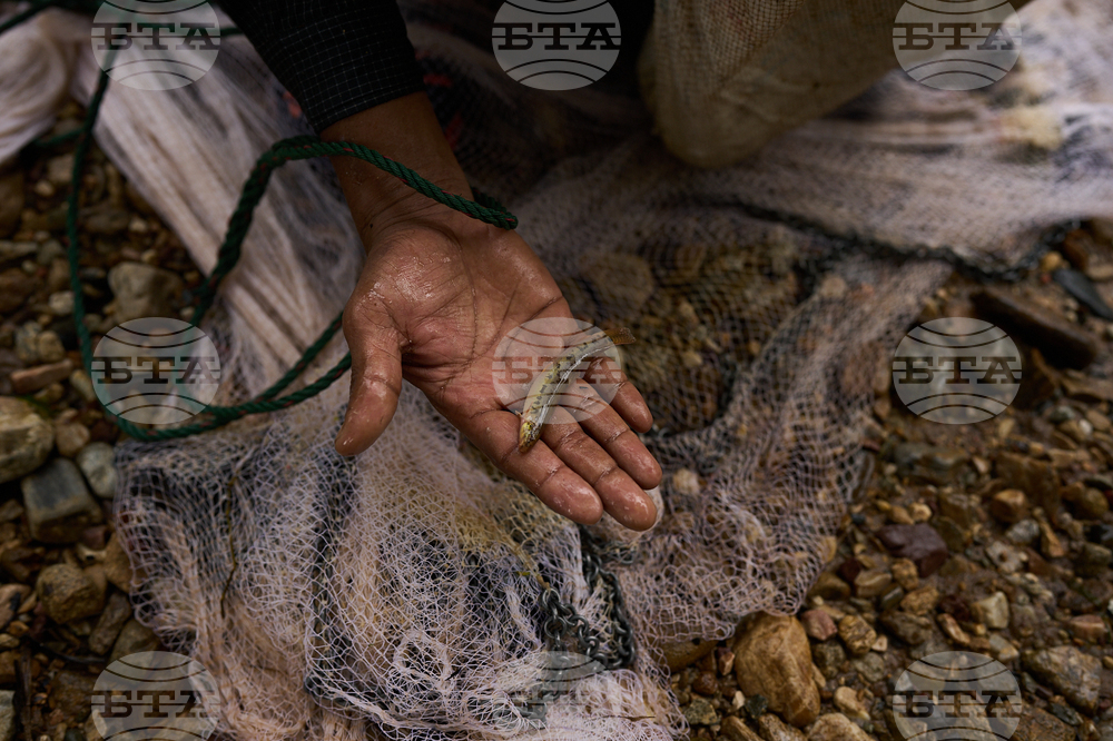 Mahmud Karmar holds a small fish he caught in the river near the Mae La refugee camp in the Tak province of Thailand, Thursday, Aug. 28, 2025. (AP Photo/Bram Janssen)