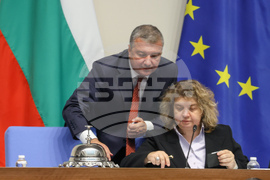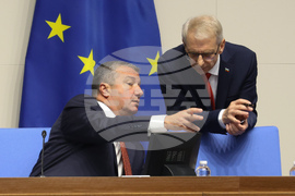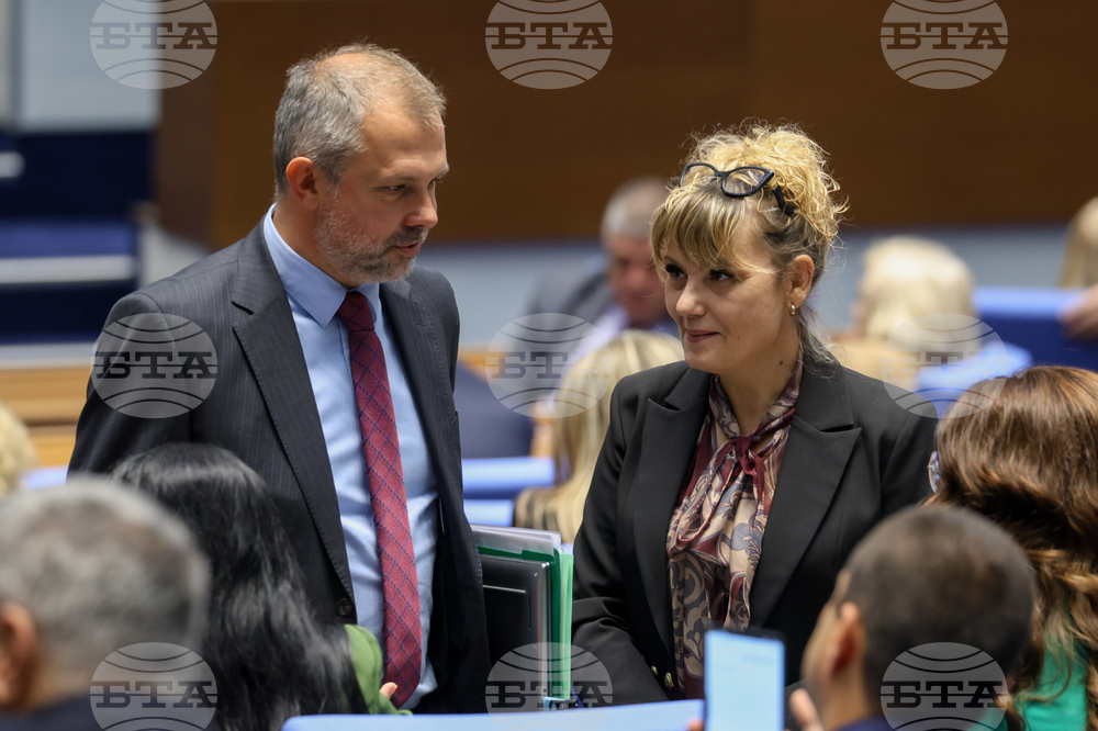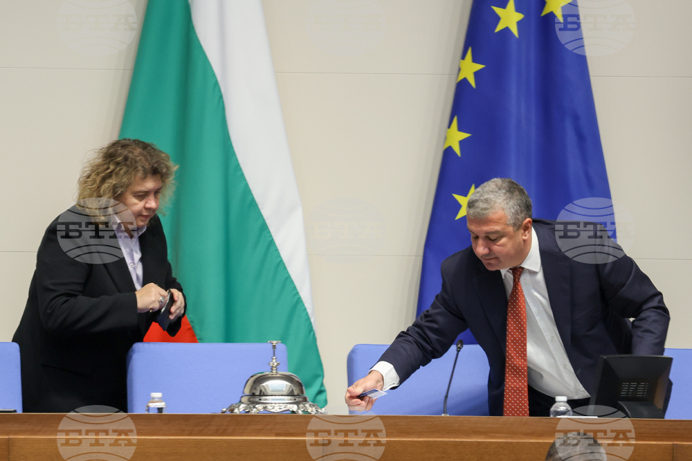 София (8 октомври 2025) Парламентът провежда редовно заседание в сградата на Народното събрание. На снимката (от ляво надясно): председателят на Народното събрание Наталия Киселова и зам.-председателят на Народното събрание Драгомир Стойнев.