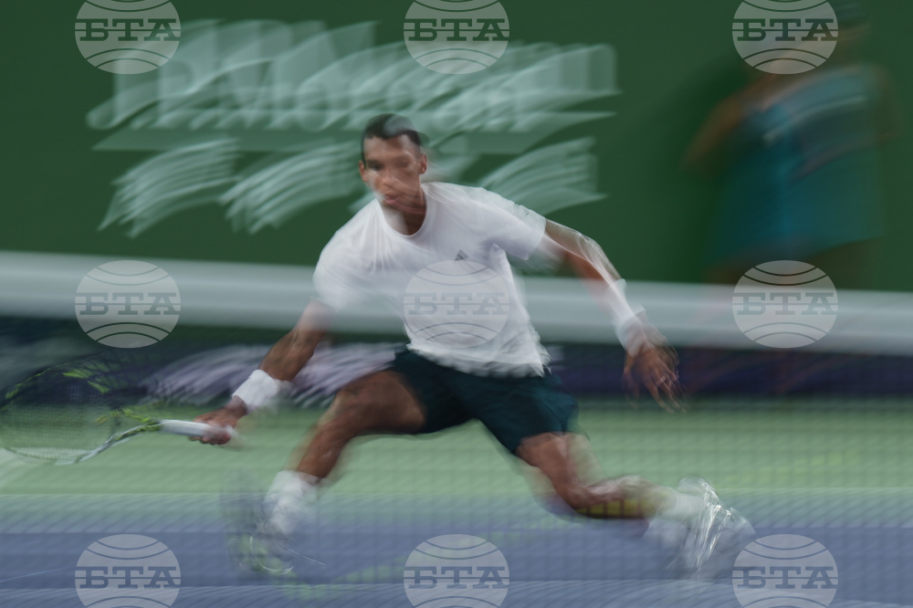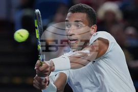 Felix Auger-Aliassime of Canada plays a backhand return to Lorenzo Musetti of Italy during a men's singles match of the Shanghai Masters tennis tournament at Qizhong Forest Sports City Tennis Center, in Shanghai, China, Wednesday, Oct. 8, 2025. (AP Photo/Andy Wong)