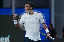Felix Auger-Aliassime of Canada reacts after defeating Lorenzo Musetti of Italy in a men's singles match of the Shanghai Masters tennis tournament at Qizhong Forest Sports City Tennis Center, in Shanghai, China, Wednesday, Oct. 8, 2025. (AP Photo/Andy Wong)