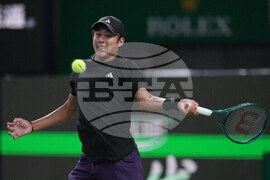 Learner Tien of the United States prepares to return a forehand shot from Daniil Medvedev of Russia during the men's singles match of the Shanghai Masters tennis tournament at Qizhong Forest Sports City Tennis Center, in Shanghai, China, Wednesday, Oct. 8, 2025. (AP Photo/Andy Wong)
