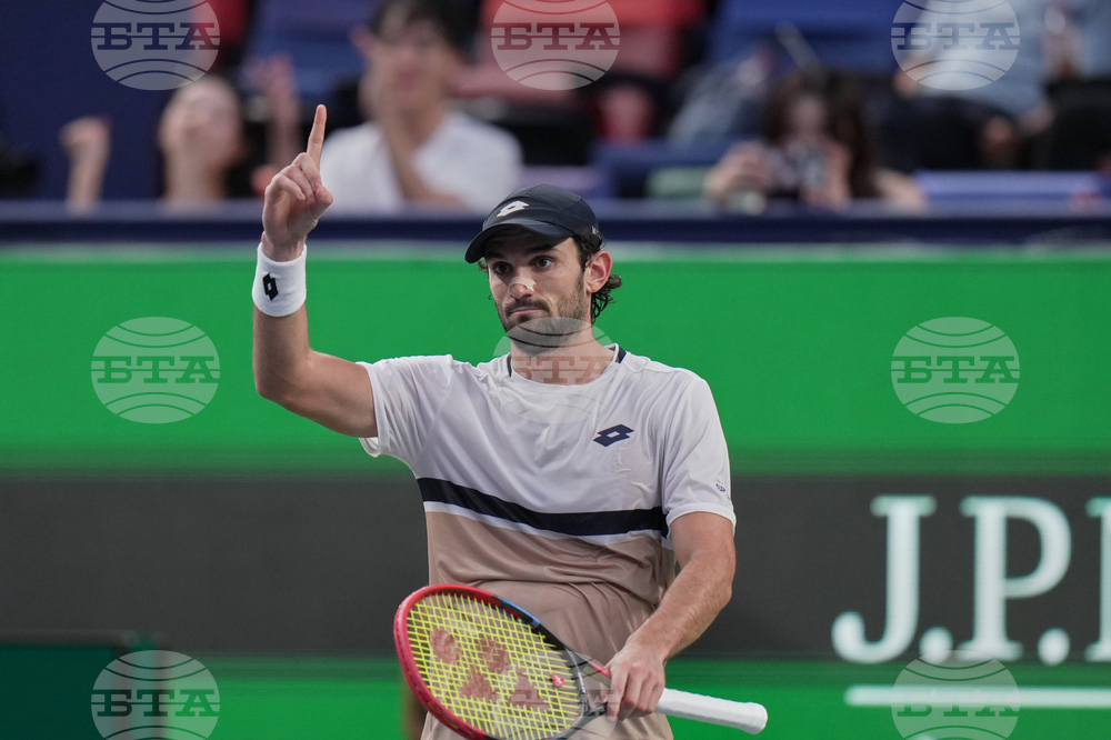 Valentin Vacherot of Monaco plays a backhand return to Holger Rune of Denmark during the men's singles quarterfinals match of the Shanghai Masters tennis tournament at Qizhong Forest Sports City Tennis Center, in Shanghai, China, Thursday, Oct. 9, 2025. (AP Photo/Andy Wong)