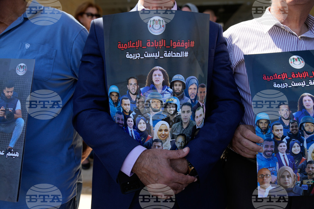 Posters with pictures of Palestinian journalists who were killed during the war in Gaza, are distributed by their colleagues during a rally to commemorate the second anniversary of the war in Gaza, in front of the United Nations office, in the West Bank city of Ramallah Wednesday, Oct. 8, 2025. (AP Photo/Nasser Nasser)