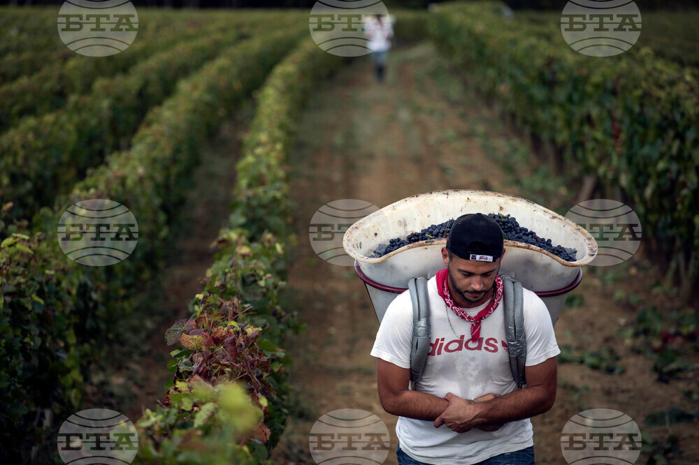 FILE - In this Sept. 12, 2017 file photo, a worker carries red grapes in a burgundy vineyard during the grape harvest season, in Volnay, central France. (AP Photo/Laurent Cipriani, File)
