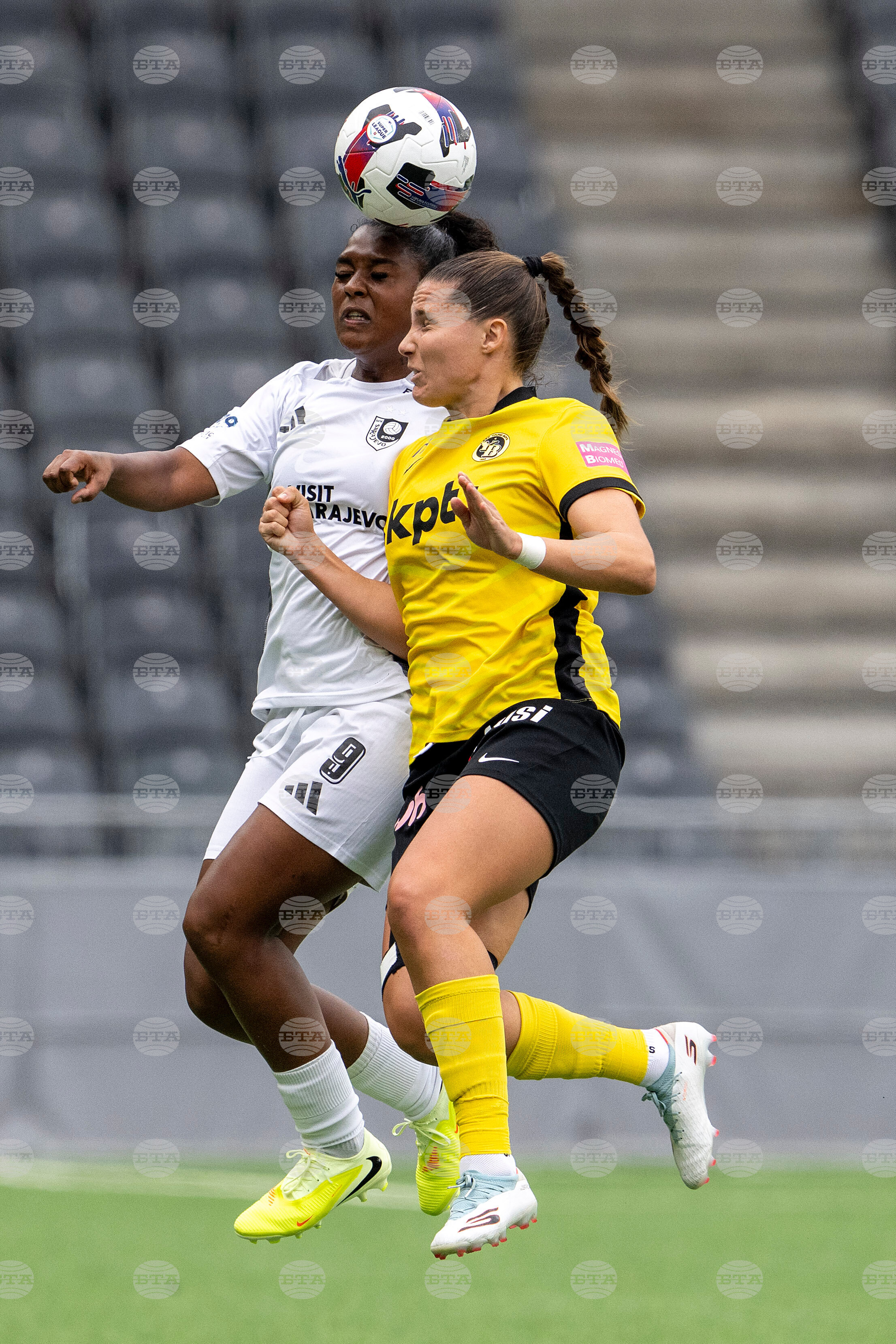 YB's Wibke Meister, top, and Sarajevo's Katarina Cadenovic in action during the Women's Europa Cup second round soccer match between BSC Young Boys women and SFK 2000 Sarajevo women, at the Wankdorf stadium, in Bern, Switzerland, Wednesday, Oct. 8, 2025. (Peter Schneider/Keystone via AP)