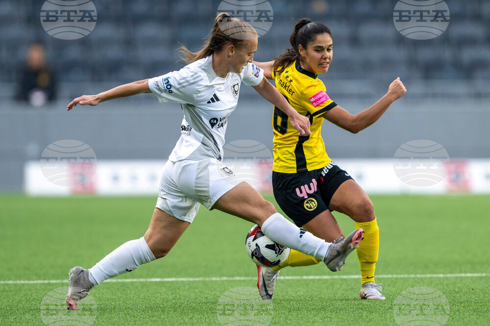YB's Wibke Meister, right, and Sarajevo's Ajla Zukic in action during the Women's Europa Cup second round soccer match between BSC Young Boys women and SFK 2000 Sarajevo women, at the Wankdorf stadium, in Bern, Switzerland, Wednesday, Oct. 8, 2025. (Peter Schneider/Keystone via AP)