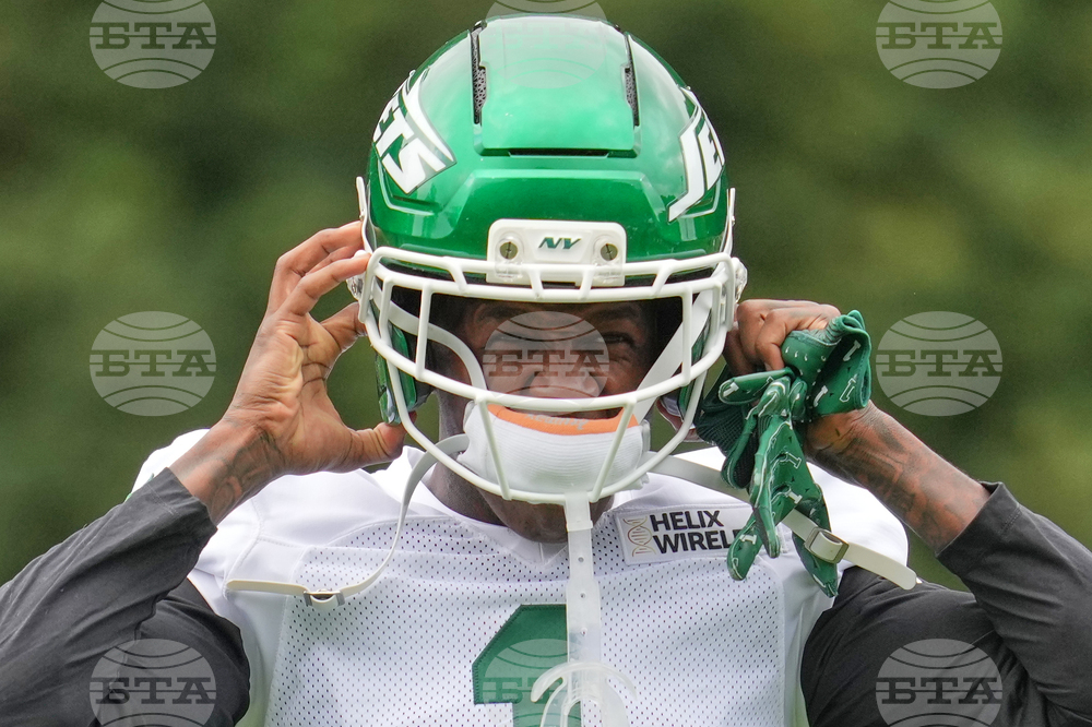 New York Jets cornerback Sauce Gardner (1) works out during NFL football practice at The Grove in Watford, England, Wednesday, Oct. 8, 2025. (AP Photo/Kin Cheung)