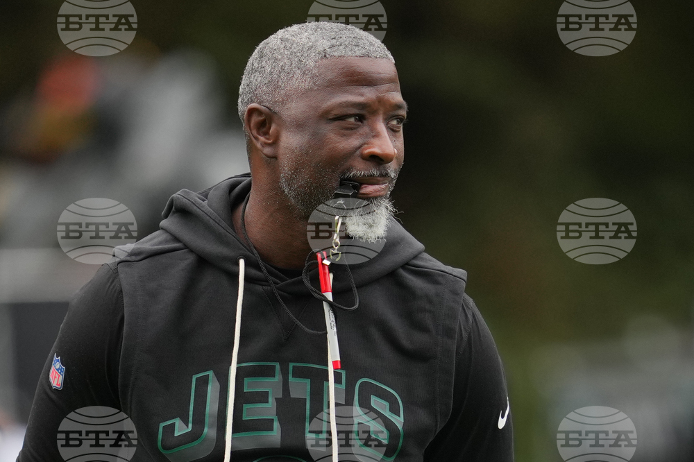 New York Jets head coach Aaron Glenn speaks during a press conference at an NFL football practice at The Grove in Watford, England, Wednesday, Oct. 8, 2025. (AP Photo/Kin Cheung)