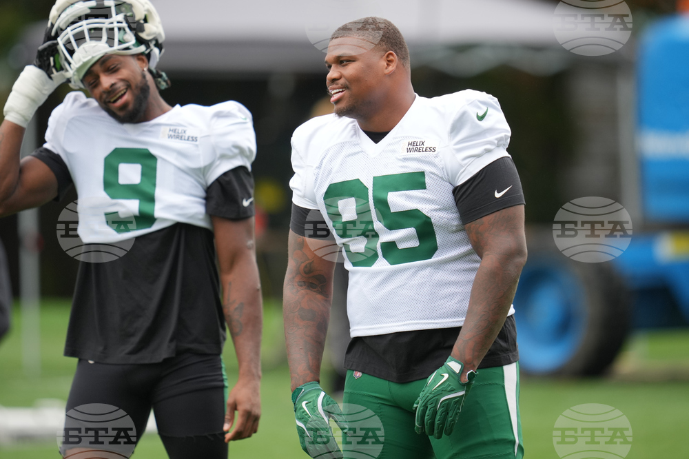 New York Jets defensive tackle Quinnen Williams, right, and defensive end Will McDonald IV react during NFL football practice at The Grove in Watford, England, Wednesday, Oct. 8, 2025. (AP Photo/Kin Cheung)