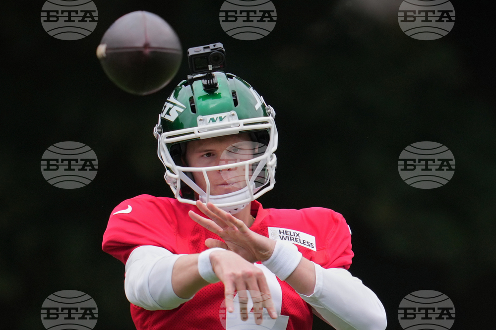New York Jets quarterback Justin Fields, center, works out during NFL football practice at The Grove in Watford, England, Wednesday, Oct. 8, 2025. (AP Photo/Kin Cheung)