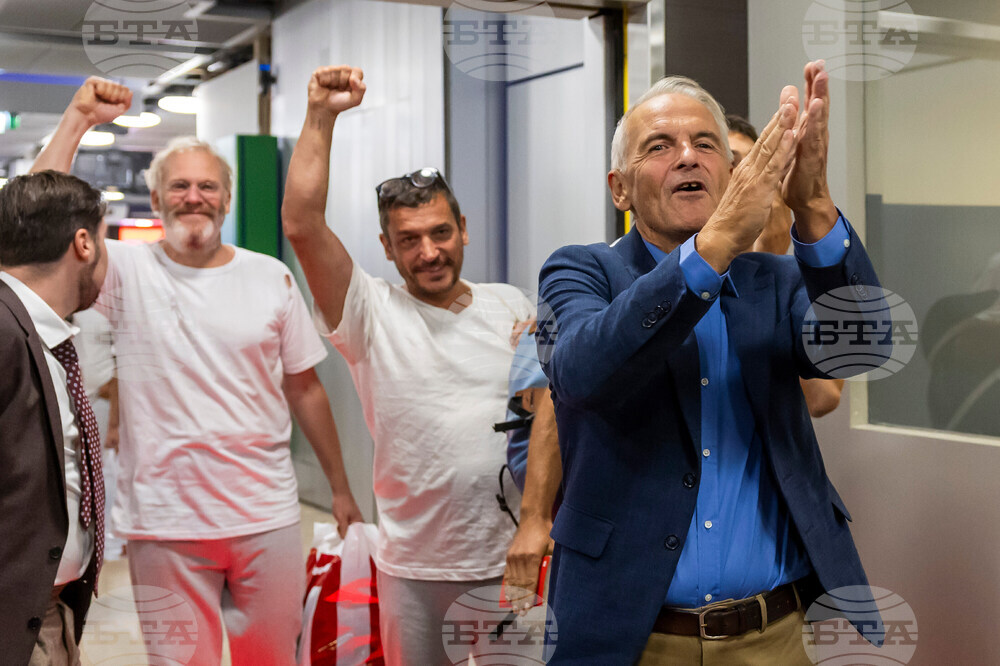 Swiss activist and former Mayor of Geneva Remy Pagani, right, and other activists from the Global Sumud Flotilla, arrive at the Geneva Airport following their deportation, in Geneva, Switzerland, Wednesday, Oct. 8, 2025. (Salvatore Di Nolfi/Keystone via AP)