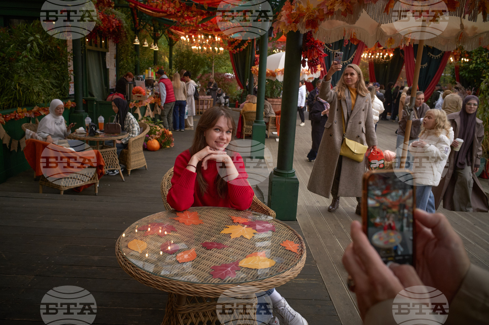 A young woman poses for her friend as other people enjoy a warm autumn day sitting in street side cafe at Manezhnaya Square near the Krmlin in Moscow, Russia, Wednesday, Oct. 8, 2025. (AP Photo/Alexander Zemlianichenko)
