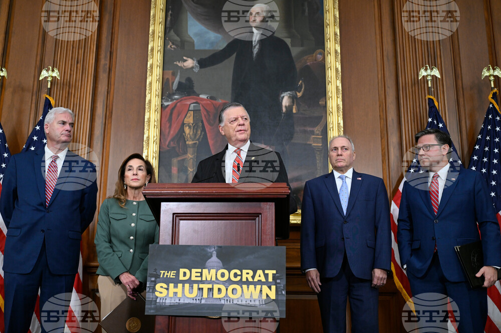 From left, House Majority Whip Tom Emmer, R-Minn., Chair of the House Republican Conference, Lisa McClain, R-Mich., House Committee on Appropriations Chairman Tom Cole, R-Okla., House Majority Leader Steve Scalise, R-La., and Speaker of the House Mike Johnson, R-La., during a press conference on the 8th day of the government shutdown at the U.S. Capitol on Wednesday, Oct. 8, 2025, in Washington. (AP Photo/John McDonnell)