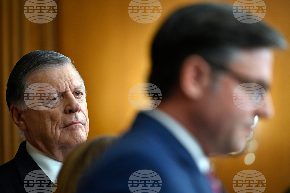 House Committee on Appropriations Chairman Tom Cole, R-Okla., left, listens to Speaker of the House Mike Johnson, R-La., during a press conference on 8th day of the government shutdown at the U.S. Capitol on Wednesday, Oct. 8, 2025, in Washington. (AP Photo/John McDonnell)