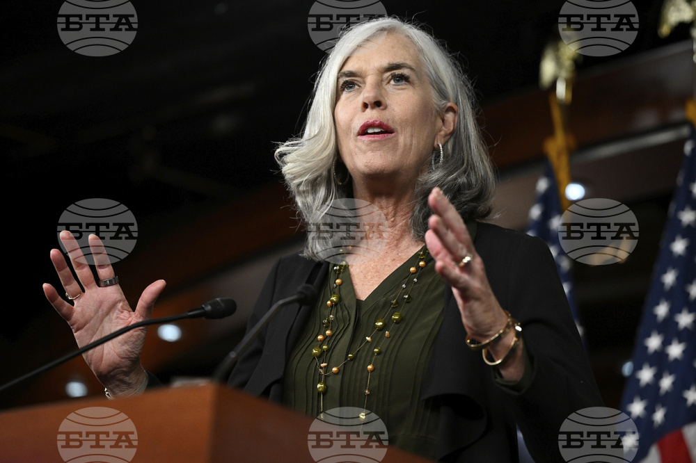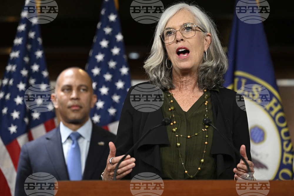 House Minority Whip Katherine Clark, D-Mass., listens to House Minority Leader Hakeem Jeffries, D-N.Y., speak at a news conference on the 8th day of a government shutdown at the U.S. Capitol on Wednesday, Oct. 8, 2025, in Washington. (AP Photo/John McDonnell)