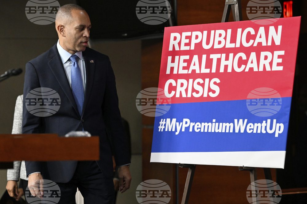 House Minority Leader Hakeem Jeffries, D-N.Y., passes a sign on a stage that the House Democratic leaders held a news conference on the 8th day of government shutdown at the U.S. Capitol on Wednesday, Oct. 8, 2025, in Washington. (AP Photo/John McDonnell)