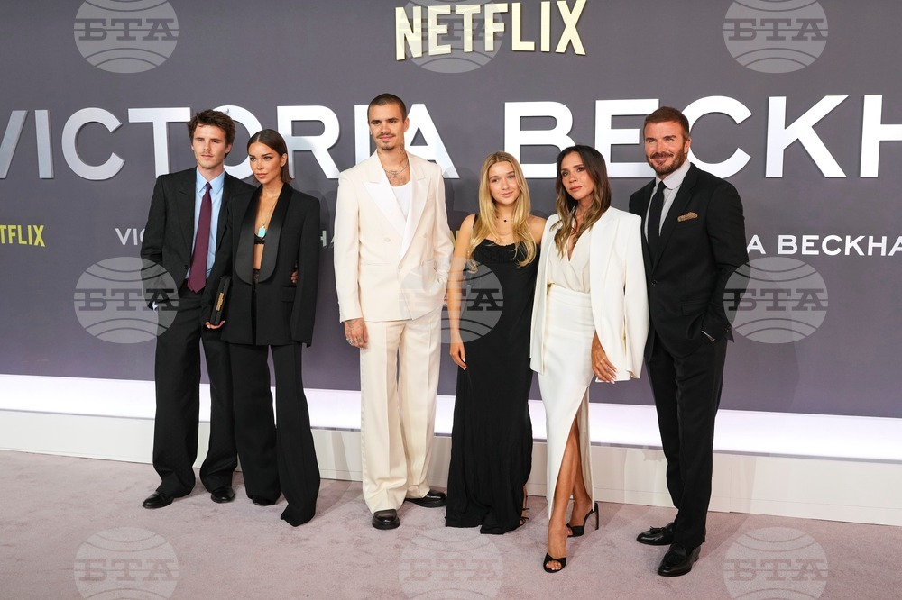 Cruz Beckham, from left, Jackie Apostel, Romeo Beckham, Harper Beckham, Victoria Beckham and David Beckham pose for photographers upon arrival at the premiere of the television series "Victoria Beckham" in London, Wednesday, Oct. 8, 2025. (Photo by Scott A Garfitt/Invision/AP)