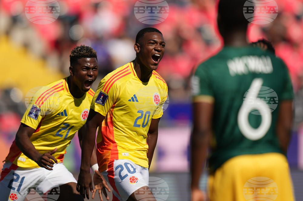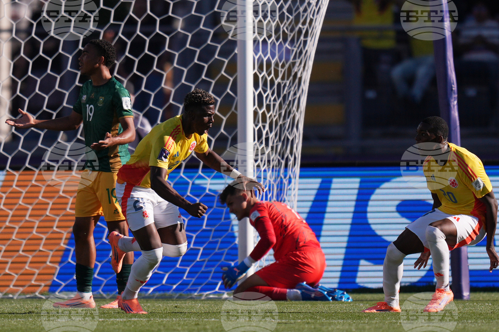 Colombia's Neyser Villareal, left, scores his side's 2nd goal against South Africa during a FIFA U-20 World Cup round of sixteen soccer match at Fiscal Stadium in Talca, Chile, Wednesday, Oct. 8, 2025. (AP Photo/Andre Penner)